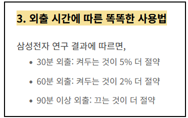 - 팁: 장시간 외출 시에는 반드시 꺼두되, 짧은 외출이라면 ‘절전모드’나 ‘26~27도 유지’ 설정을 활용하세요.
