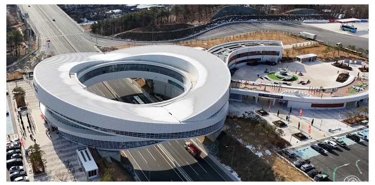 처인휴게소는 고속도로 위에 떠 있는 구조로, 마치 공중에서 쉬는 듯한 색다른 느낌을 줍니다. 두 개의 커다란 반지가 교차된 듯한 외관은 기존 휴게소와 완전히 다른 이색적인 매력을 선사하죠.