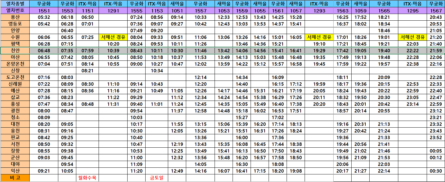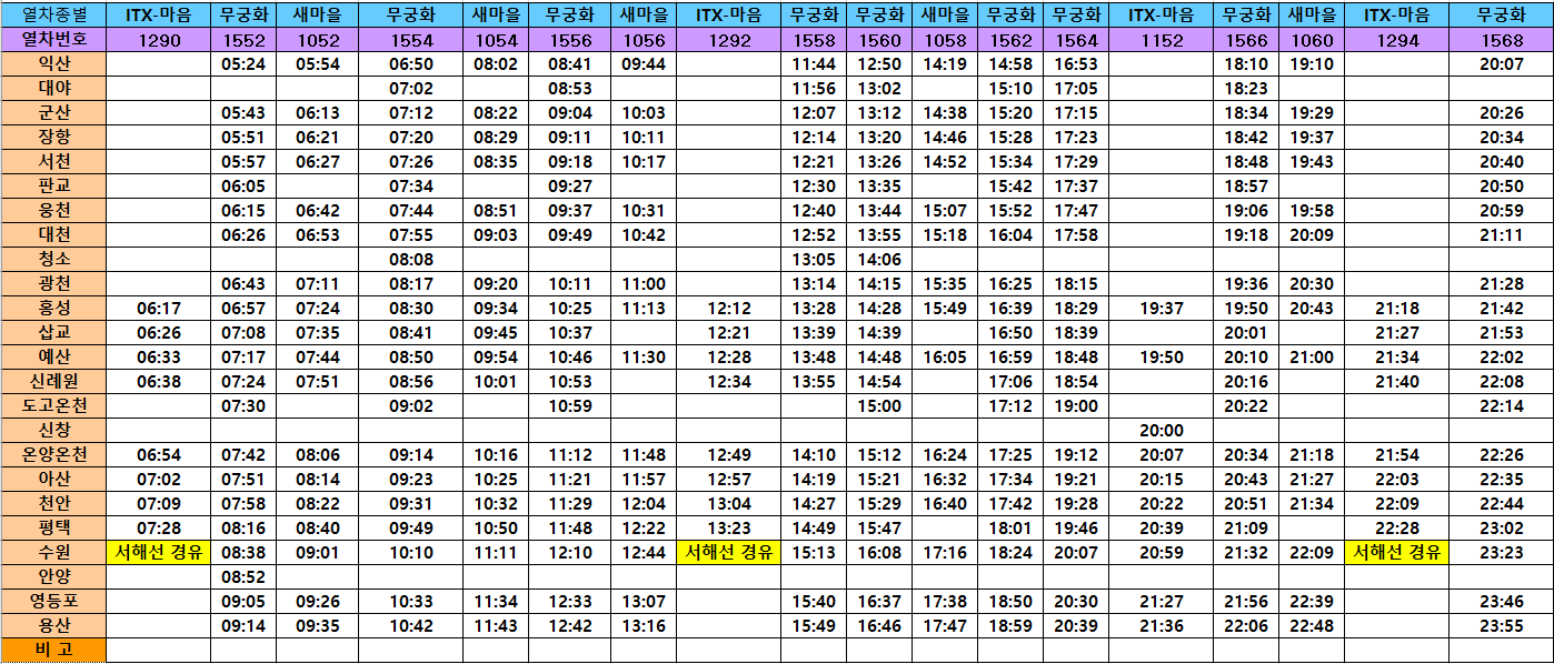 장항선 노선은 용산에서 출발해서 수도권과 경기권을 거쳐 천안역과 주요 역들을 지나갑니다. 장항선의 시간표는 무궁화호와 ITX-새마을 열차로 나뉩니다.